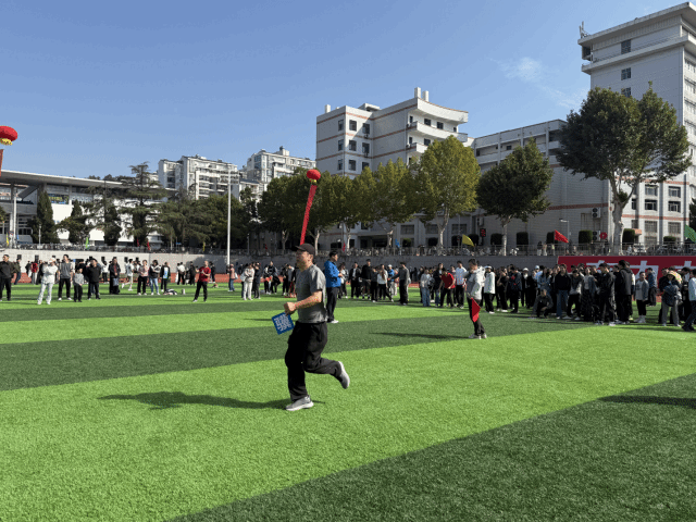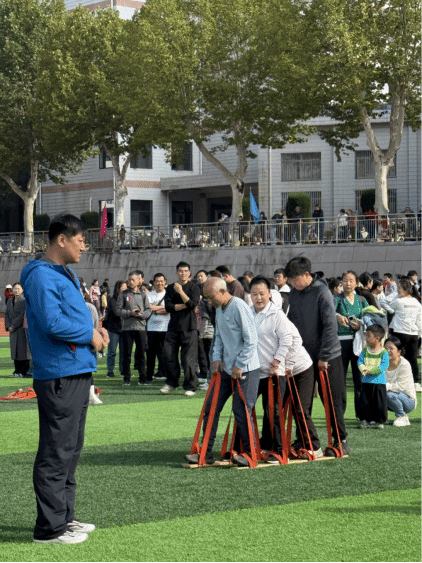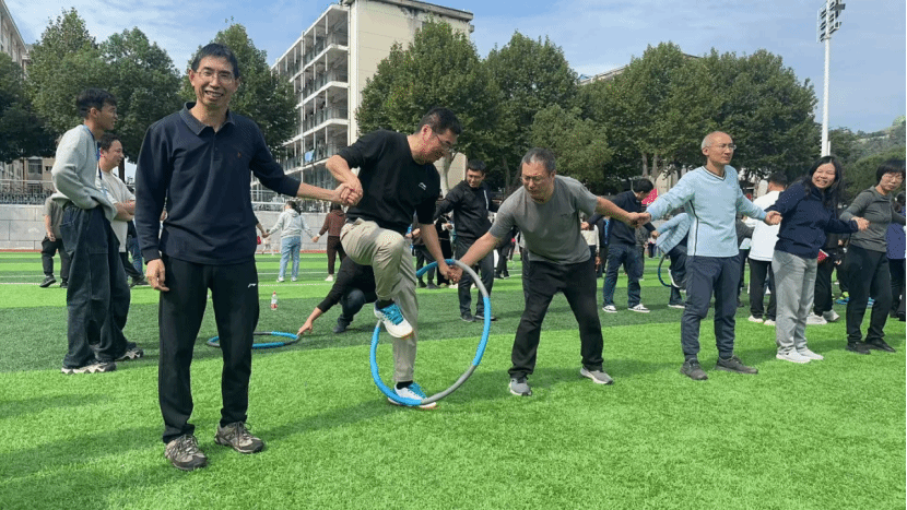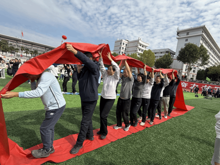 在充满欢乐的趣味运动会赛场上,老师们团结协作,同心协契,将课堂上的睿智与从容化为赛场上的默契与拼搏。