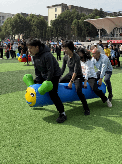 跨坐在“欢乐毛毛虫”上,老师们口号嘹亮,动作齐整,全力冲向终点,斩获全校第三名的佳绩,欢呼声是对他们团队精神的最佳褒奖。