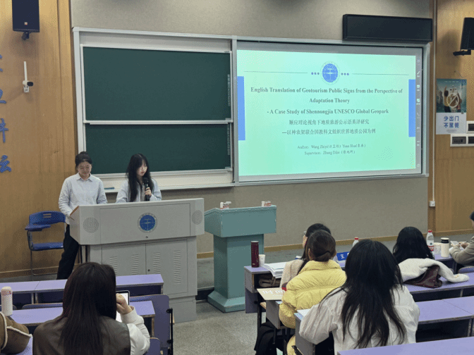 报告会正式开始,12组汇报人依次登台,论文选题与时俱进,紧跟国家发展方向,涵盖翻译传播、跨文化交际以及AI大语言模型等多个研究领域。
